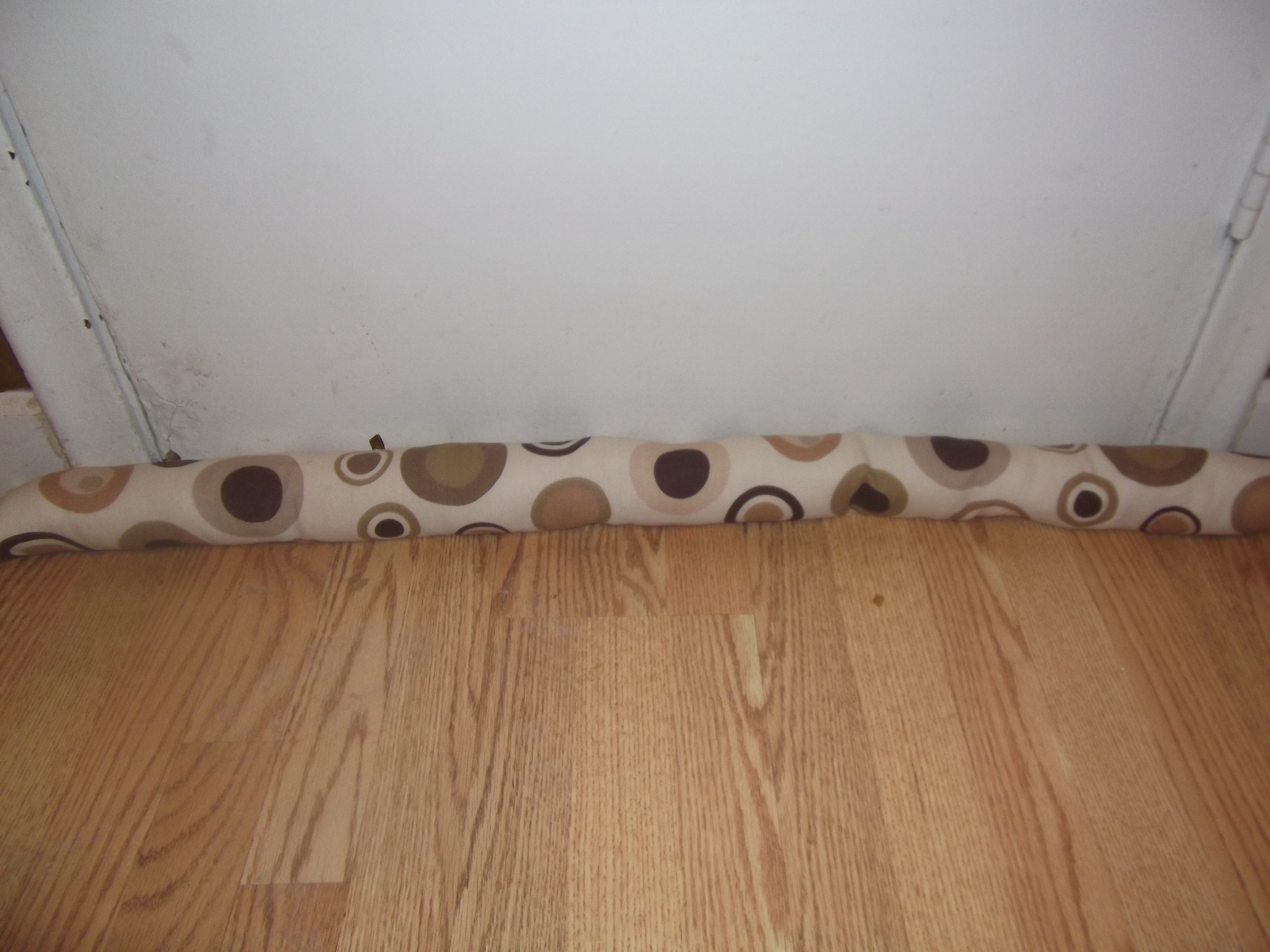 First, I made a door snake or bumper or whatever they are called.  I just took some scrap fabric (I sew a lot, so I have a lot of scraps.  If you don’t, you probably know someone who sews, so ask around.  Or you can get enough fabric for this for about 50 cents.) and sewed it into a tube, leaving a section open to be able to turn it inside out.  Flip the tube rightside out and fill it.  I filled one with batting and some rice to weigh it down.  (Again, I just happen to have batting laying around.)