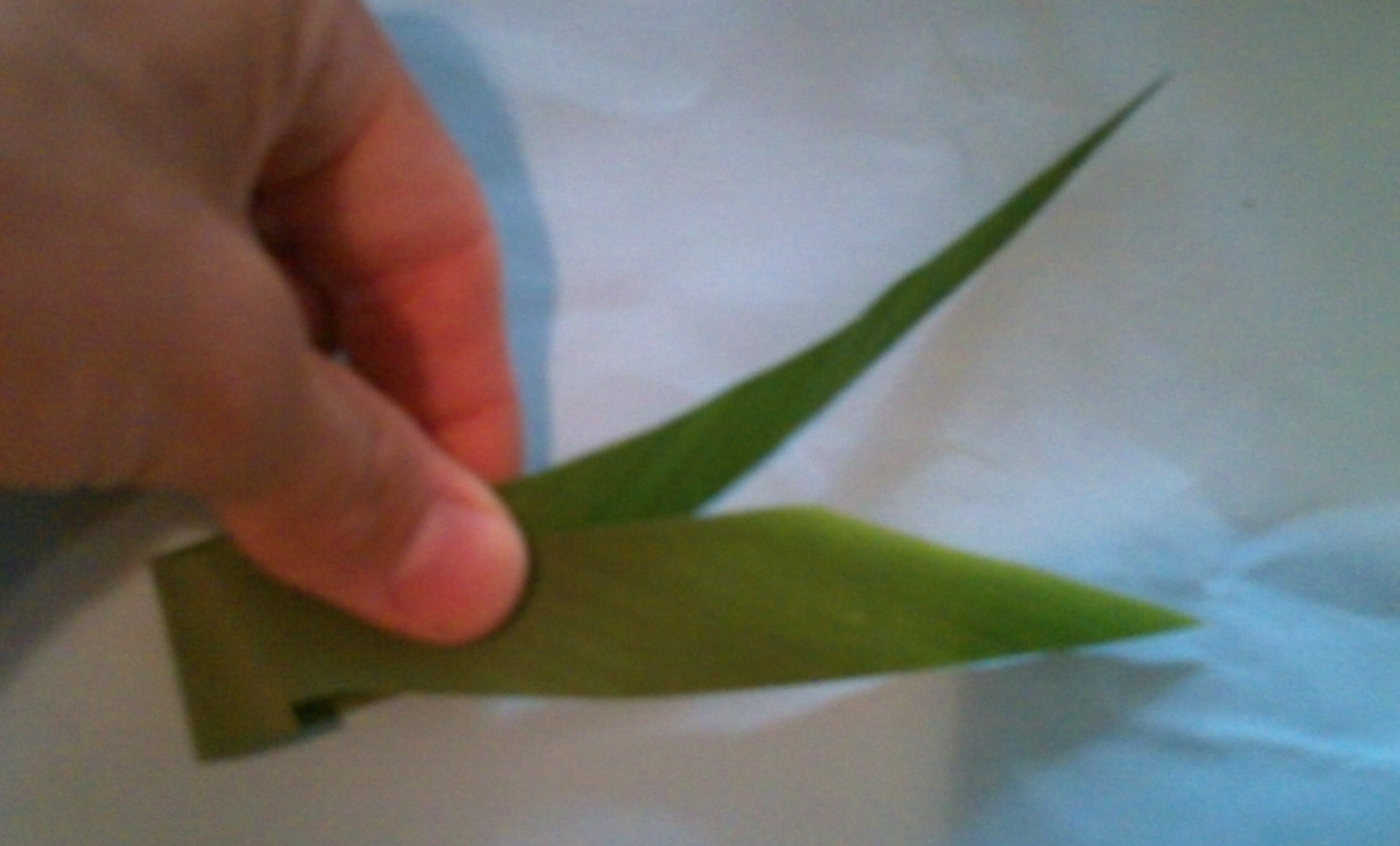 It is recommended that a leaf or two follows a row of flowers. I cut ti leaves at an angle and at about 6 inches long. I then folded them in half with each side slightly off center, then strung the string through the point where both halves met.