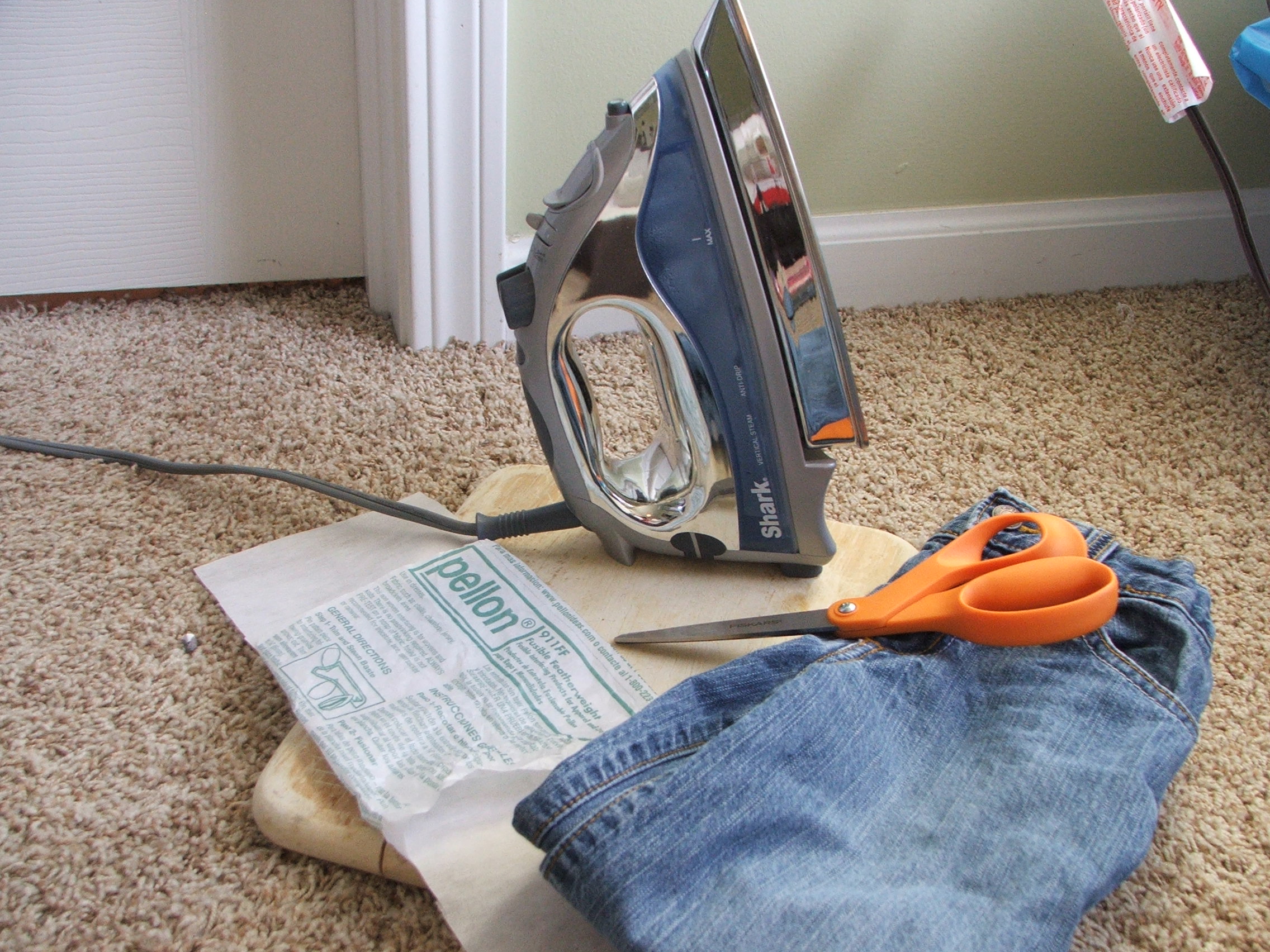 Then firmly press in the middle of the fabric, until the whole thing is fused to the jeans. If it is not sticking, make sure your iron is hot enough, that you are pressing firmly, and that you are on a hard surface. Also, I found much more success when I had steam in my iron and could steam it down as well.