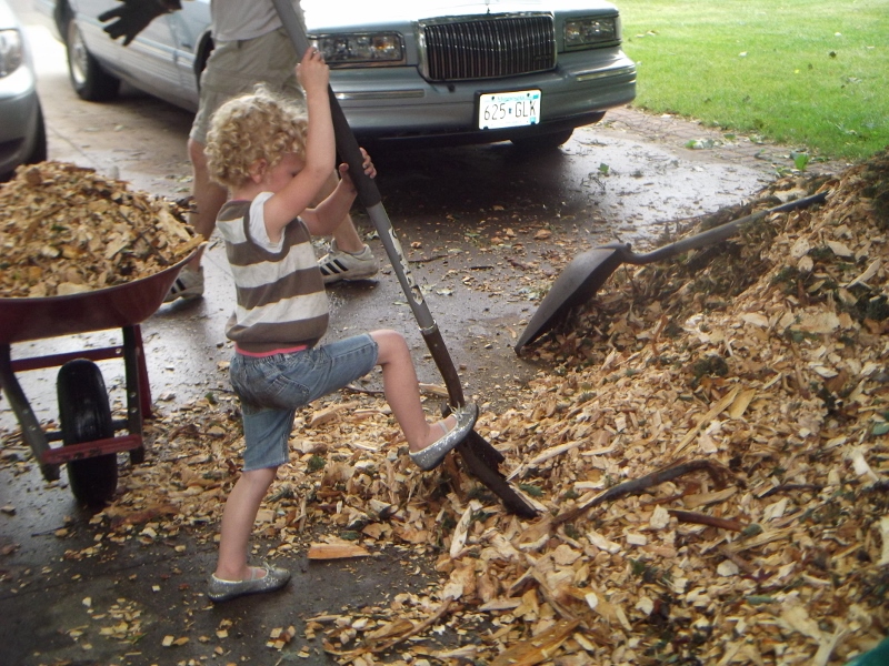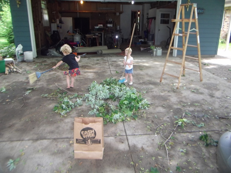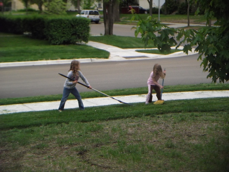 Sometimes my husband will have them help rake, sweep, and bag the grass after mowing and trimming. Again, ten cents a bag is good enough motivation at this age. But it adds up VERY slowly.