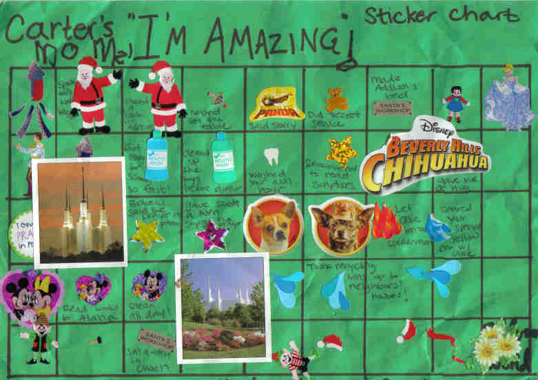 Our sticker charts at home are called “I’m Amazing!” charts. Whenever we see the kids doing something great, we give them a sticker to add to their own chart. We tell them specifically what the behavior was that we liked, and as they put the sticker on they exclaim “I’m AMAZING!” Then we write what they did below the sticker. Inevitably, the kids then review what they did for all their stickers–a great reminder and reinforcement for the positive behavior!