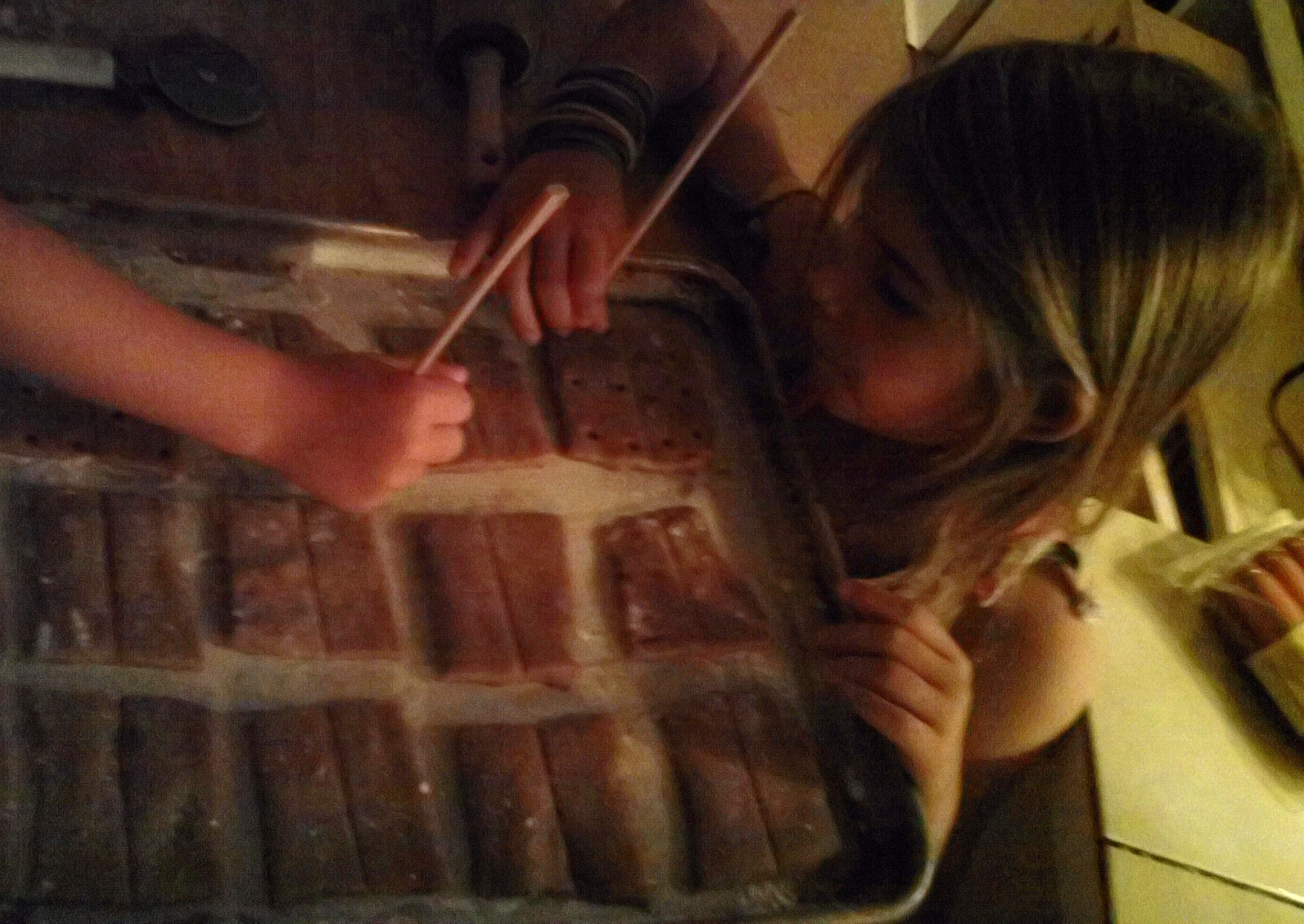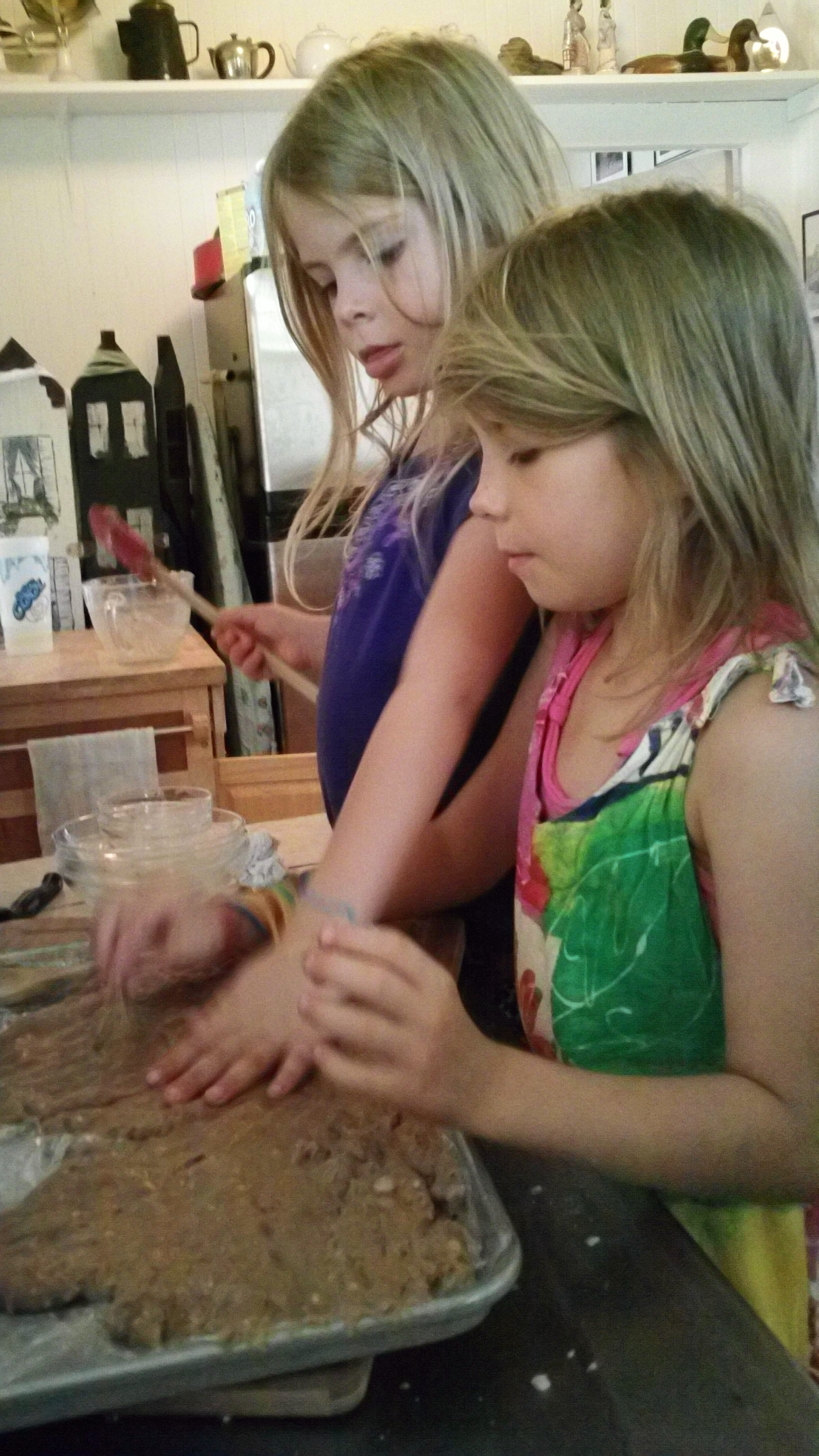 A fun way to involve the kids -- here are my daughters patting down the dough into a rectangle.