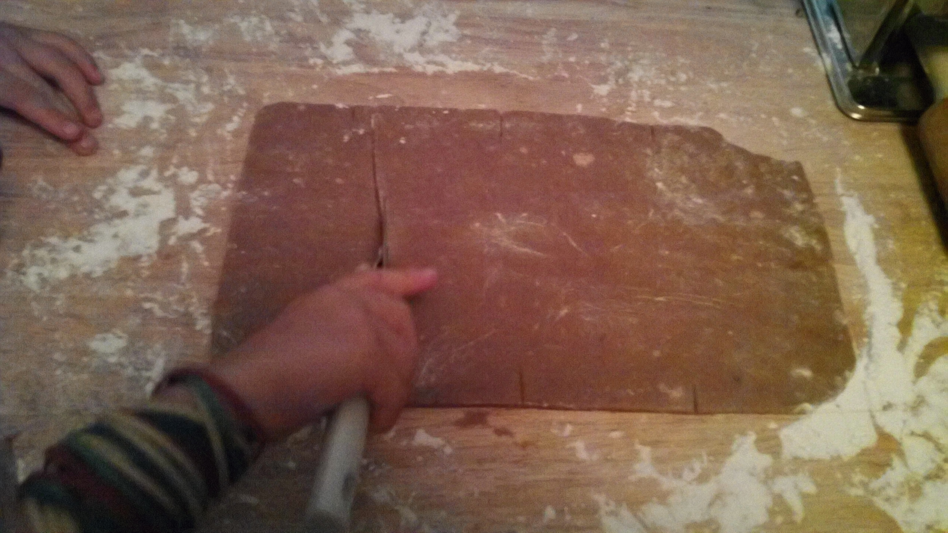 Roll out the crackers: Divide the dough in half and return one half to the refrigerator. Sift an even layer of flour onto the work surface and roll the dough into a long rectangle about 1/8 inch thick. The dough will be sticky, so flour as necessary. Trim the edges of the rectangle to 4 inches wide. Working with the shorter side of the rectangle parallel to the work surface, cut the strip every 4 1/2 inches to make 4 crackers. [I used a pizza cutter, and love the design of this one that’s kid- friendly]