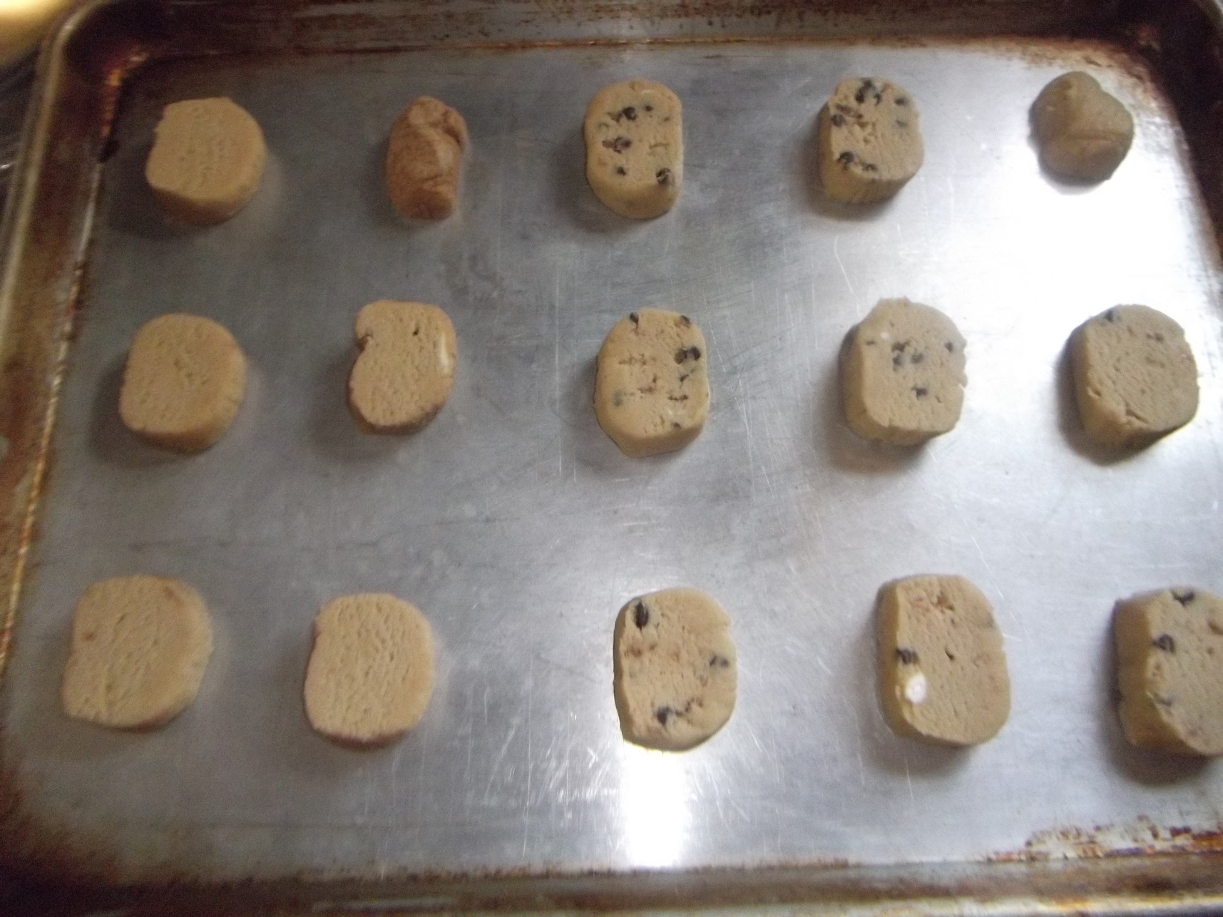 When you’re ready to have some fresh baked cookies, just cut a few slices of dough and pop them on the cookie sheet. No need to bring to room temperature!