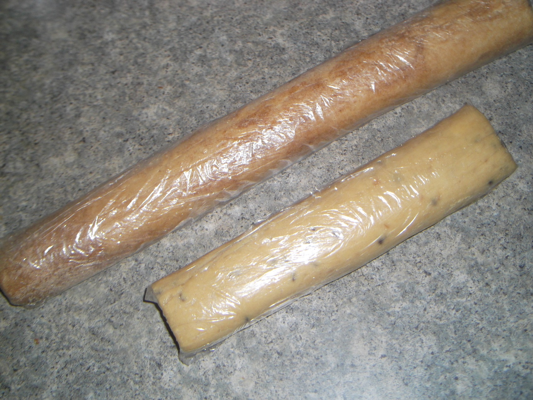 So, make your own refrigerated cookie dough rolls! After you make your dough, just lay out a big sheet of plastic wrap and plop down your dough in the middle of it in a rough “log”. Then cover it with plastic wrap and roll it up. Then, work the dough into an even log with your hands, pulling and pressing it along in the plastic. Wrap up the ends and pop it in the fridge.