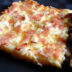 - Squeeze any excess moisture from the potatoes and combine them with the melted butter or margarine in a small bowl. Press this mixture into the bottom and sides of an ungreased 10 inch pie pan or 9×13 pan.