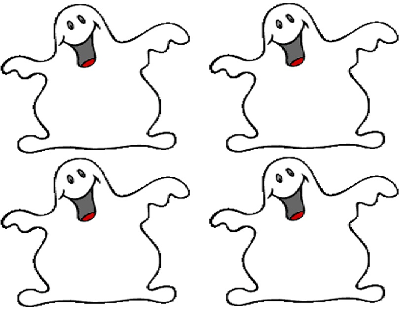 First, you'll need to print out 6 white ghosts, and 6 ghosts of different colors (red, blue, orange, green, yellow, and pink) for a total of 12 ghosts. I've printed mine on those colored papers, though you could also just color them in, too. Here's a template for the ghosts.