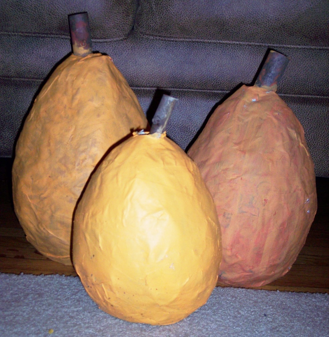 My incredible sister, Kerri, suggested making paper mache pumpkins with my kids. So over the course of a few days, we did. They turned out lumpy and bumpy (that’s what you get with you have little ones doing the work!) but I have to say I love them. I wish I had depressed the centers of the tops so they didn’t look like orange pears and they definitely need another coat of paint, but they were fun to do. The kids loved them. We just blew up a balloon and went to work. The stems are cut tree branches from our back yard.