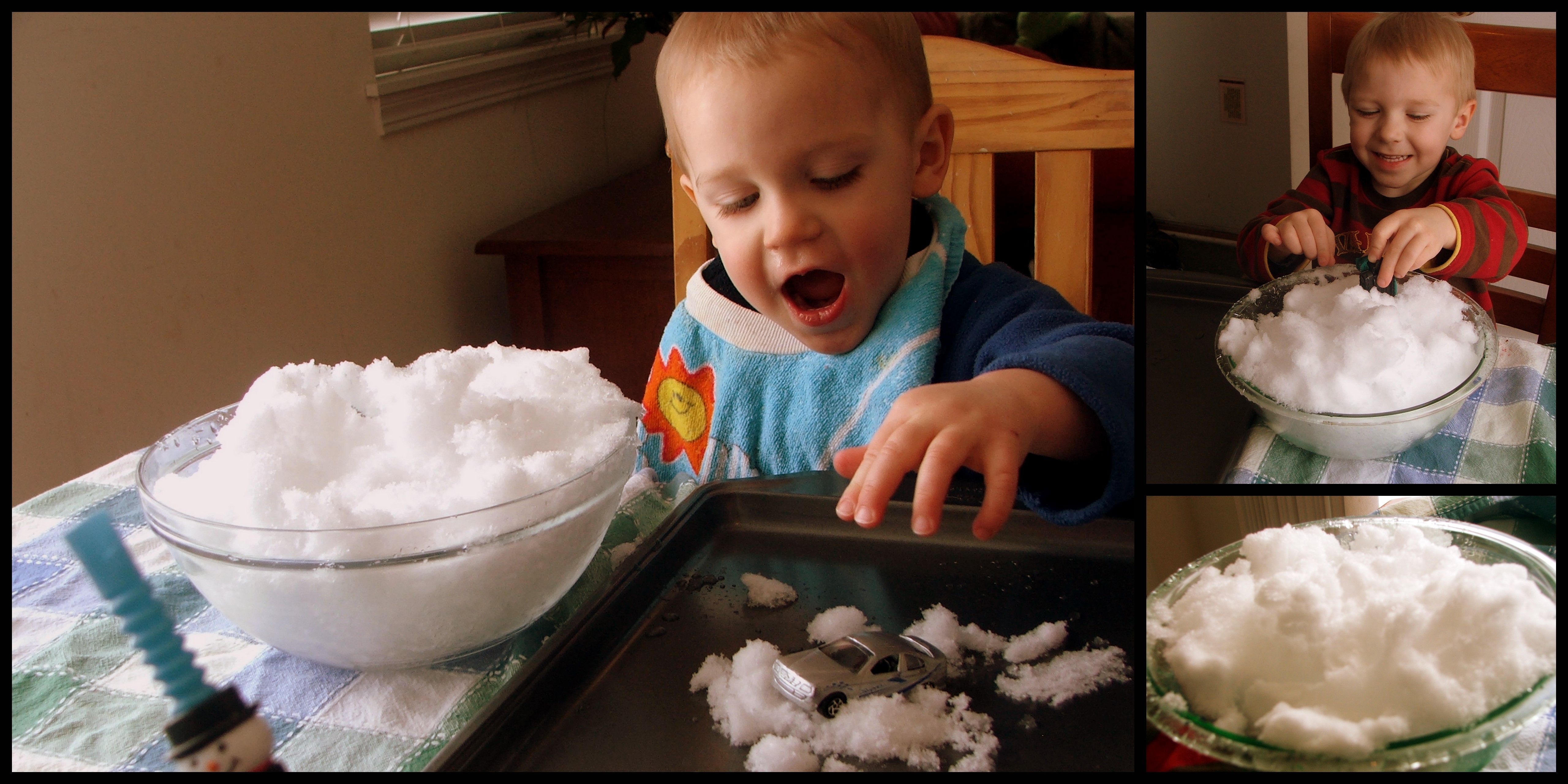 Who says that “playing in the snow” has to happen outside? I grabbed one big bowl of snow, gave them cars and cookie trays, and they went to town building snowmen, race tracks, and bridges. Playing in the snow just got more accessible, everyone!