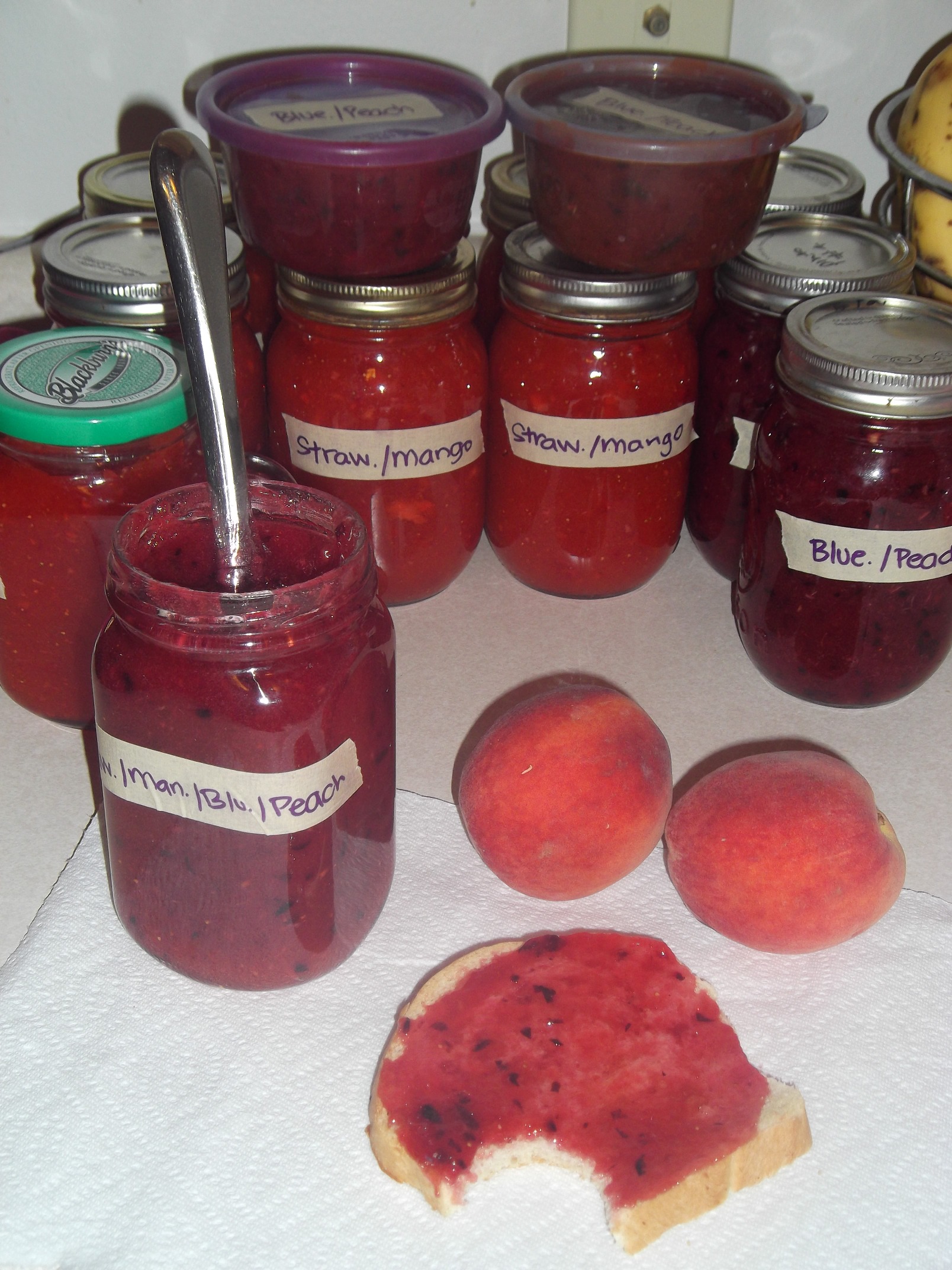 That being said, there are a few tricks that I've learned that go AGAINST the instructions. First, you CAN use frozen fruit when you are making combination jams. If you're making plain strawberry, you must use fresh strawberries. But if you're making strawberry-mango, you can use frozen mangos with fresh strawberries. Or with raspberry-peach, you can use frozen raspberries with fresh peaches. Same with blueberry-peach, you can use frozen blueberries.